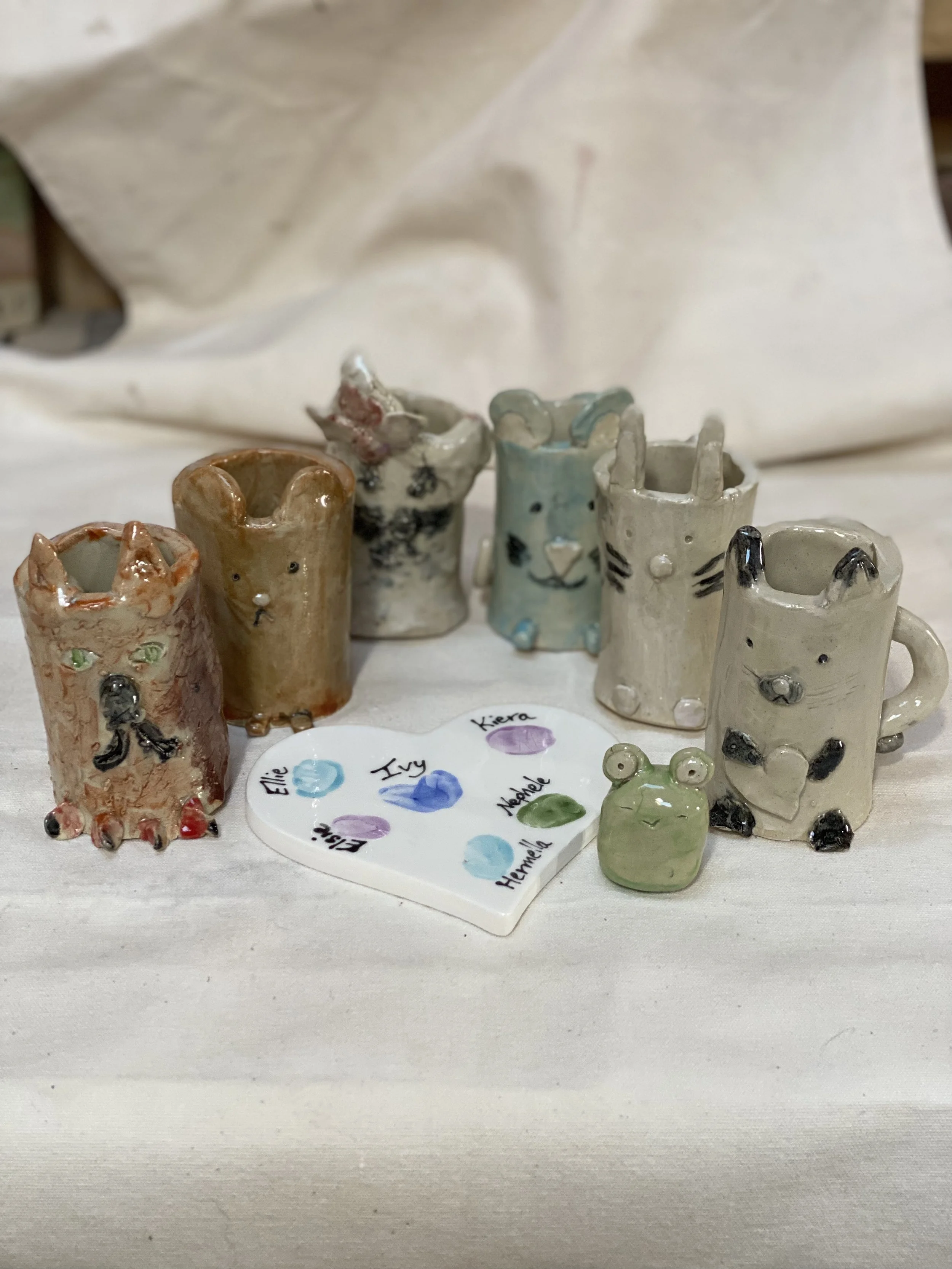 These handbuilding parties are perfect for birthdays or creative get-togethers, with projects designed to engage and inspire. We’ll usually make a small animal sculpture and either a matching bowl or dish for it to sit in, or a pen pot holder with animal decorations, but if your child has something specific in mind, just let me know and we’ll plan around it!